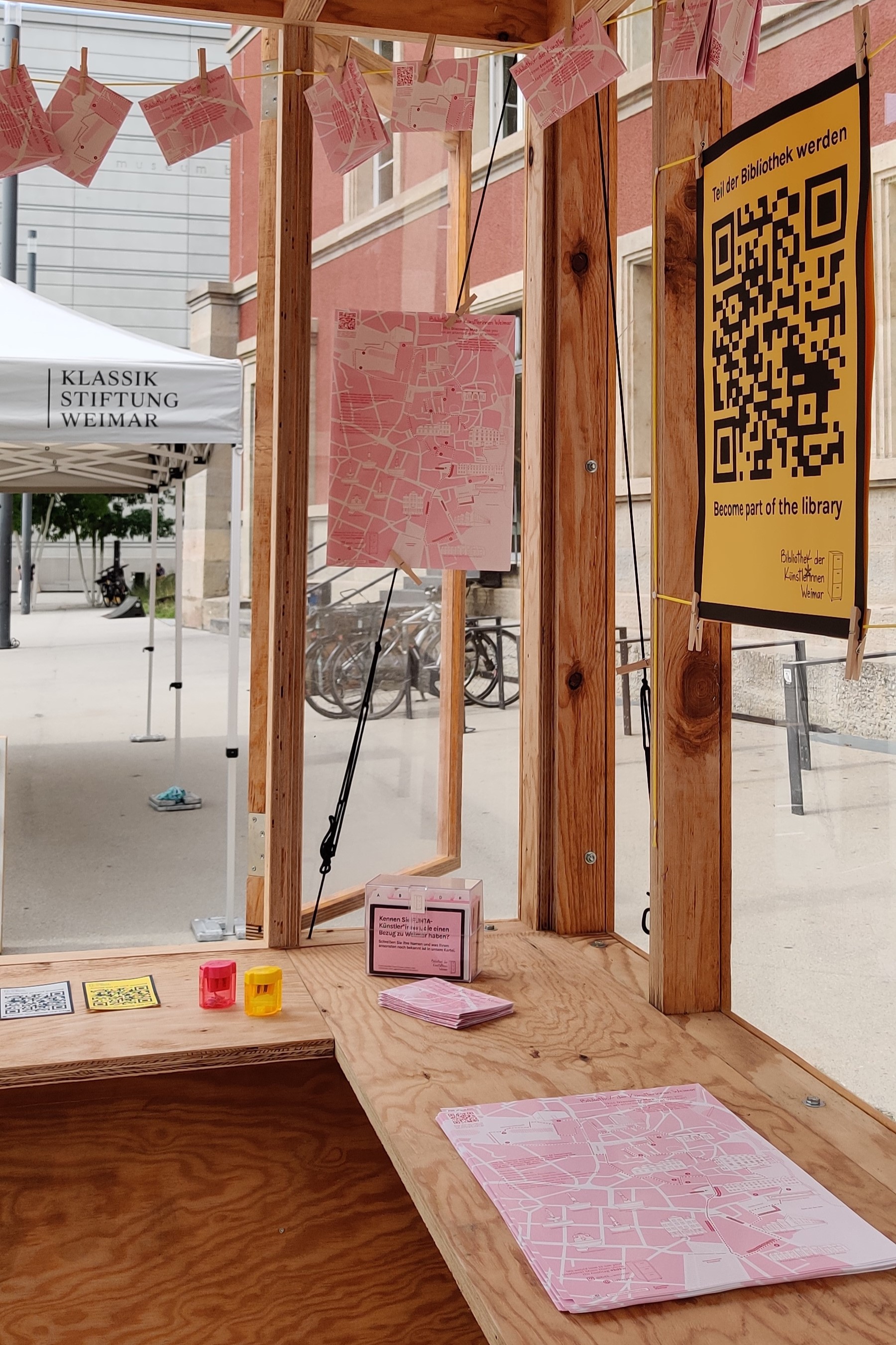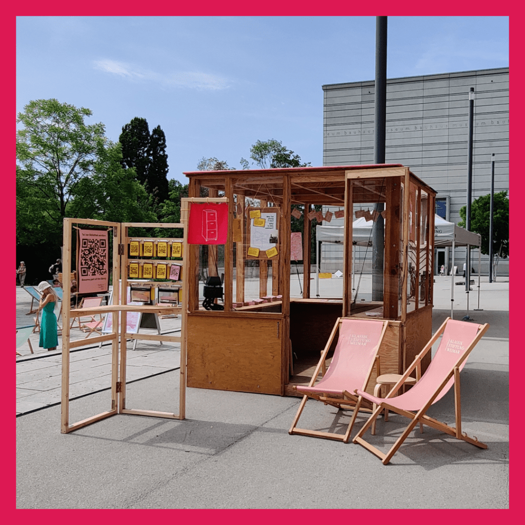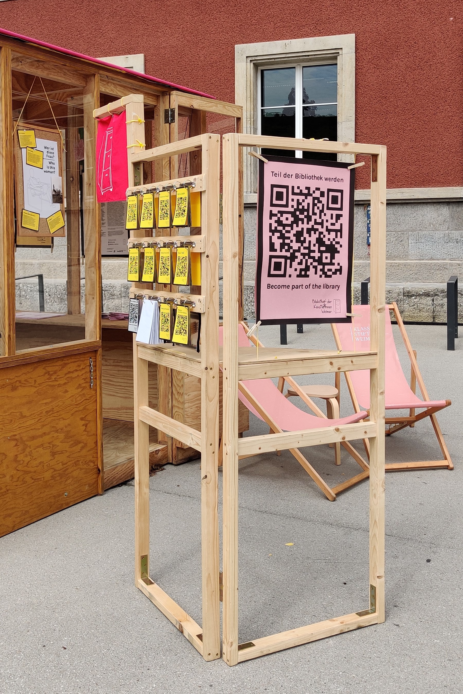 From 15th August – 10th September, the Klassik Stiftung Weimar, in cooperation with the Bauhaus-Universität Weimar and Kunstfest Weimar, recreated the Bauhaus Weeks which commemorates the 100th anniversary of the first major Bauhaus exhibition in Weimar with numerous workshops, performances and music. We were delighted to have been invited to take part and host a series of Open Library Days from the 15th-20th August inside one of the Bauhaus Cubes in front of the Bauhaus Museum Weimar, Stéphane-Hessel-Platz. Here, visitors could speak to us firsthand about joining our collection as well as learn more about our current FLINTA* Artists and past projects.