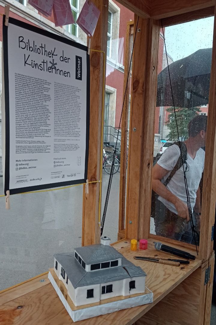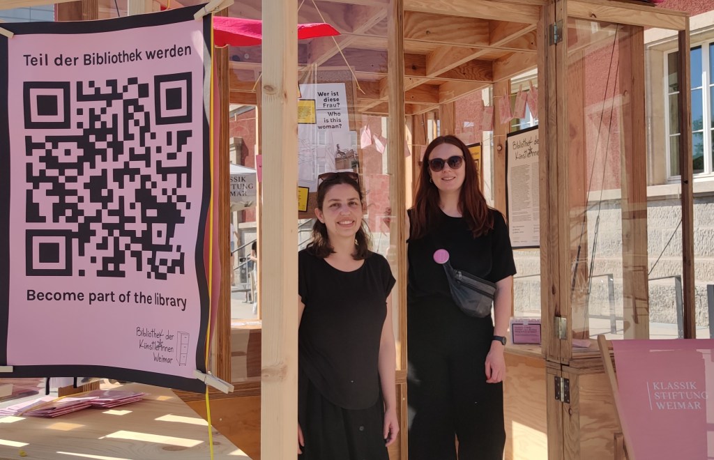 Vom 15. August – 10. September lässt die Klassik Stiftung Weimar in Kooperation mit der Bauhaus Universität Weimar und dem Kunstfest Weimar die Bauhaus-Wochen in Weimar wieder aufleben, die mit zahlreichen Workshops, Performances und Musik an das 100-jährige Jubiläum der ersten großen Bauhaus-Ausstellung erinnern. Wir haben uns sehr über die Einladung gefreut, vom 15. bis 20. August eine Reihe von Tagen der offenen Bibliothek in einem der Bauhaus-Cubes vor dem Bauhaus-Museum Weimar, Stéphane-Hessel-Platz. Hier konnten die Besucher*innen mit uns über die Teilnahme an unsere Sammlung sprechen und mehr über unsere aktuellen FLINTA*-Künstler*innen und vergangenen Projekte erfahren.