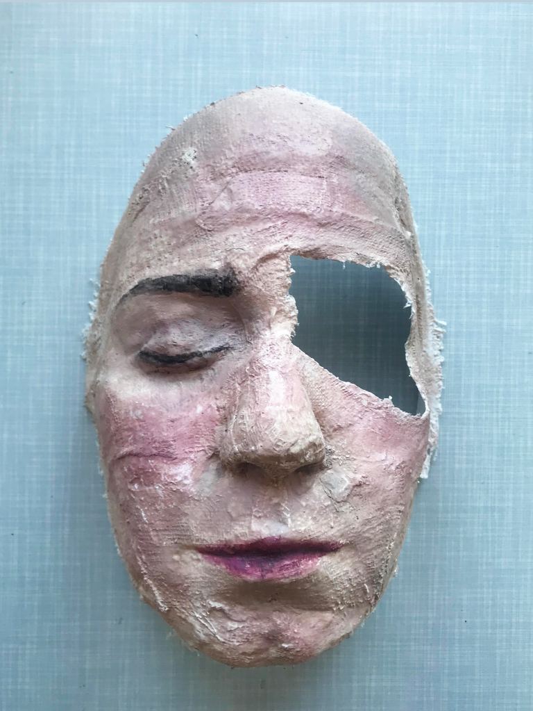 Maskenentwurf für “Trenta denari” (2021). Performance-Arbeit. Abguss des Gesichts der Künstlerin in Gipsbinden, Acryl. Gestiftet von der Künstlerin.