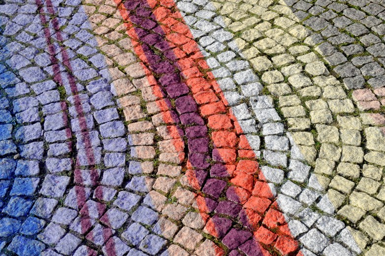 If Only To Kill Time (2015). Photos of intervention. Chalk on cobbles. 900 x 200 cm. Bauhaus Museum, Weimar, Germany. Donated by the artist.