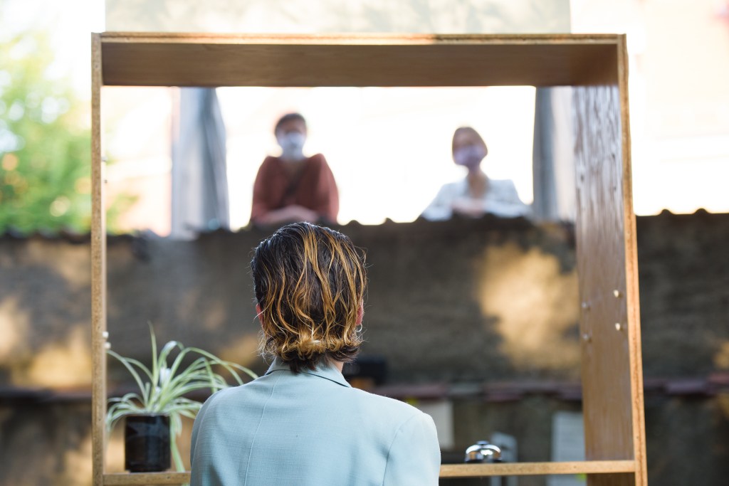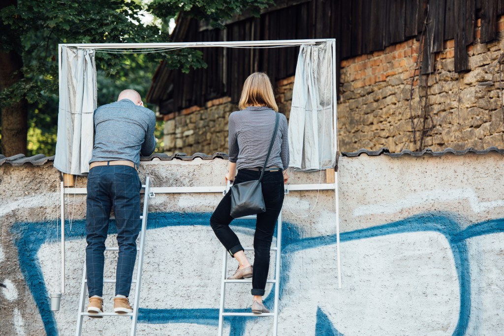 “Over Walls” invites passers-by to interrupt their everyday lives and expand their familiar urban space by looking over the edge of a wall. Together with another person, a cooperative act must be entered into, in order for a curtain to open. On its other side, a short performance awaits the two, which has been developed site-specifically by the collective. In 2019 at the Political Art Days in Dresden, the installation became an urban planning tool when the audience looked into an abandoned garden and was invited to develop a shared vision for its future. Whereas at the STAMP Festival 2021, the two lives of a house in Hamburg Altona were interrelated and compared. The building that is now a hotel was once a maternity clinic.
